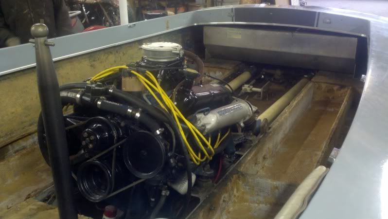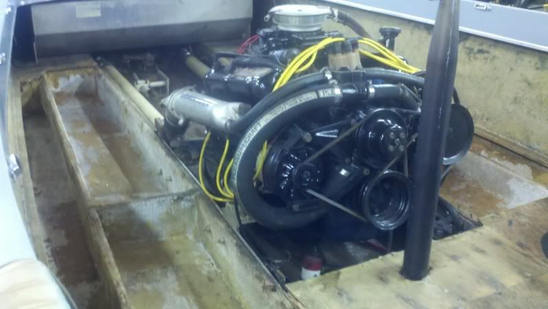 The motor looks really good and supposedly runs very well. (He is going to let me hear it run this weekend after our little spring snow storm tomorrow). He had it running last year then winterized it this winter. The boat itself has 1092 Hours on it. I don't know if that is what the engine has on it but like I said it looks really good. All the engine accessories have been sandblasted or powder coated ( The pulleys, the valve covers, intake manifold etc.) It has some sort of aftermarket exhaust manifolds on it. Im sure it sounds nice.