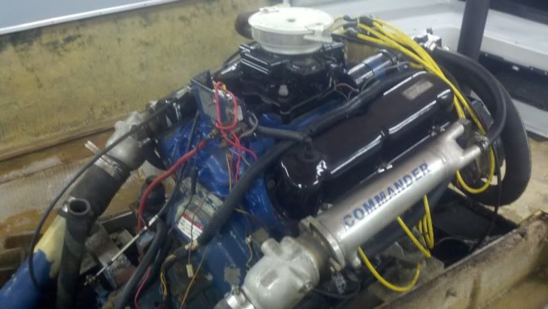 Looks good. That motor is a Ford 351 Windsor maranized by commander. Stock they were 240hp. I think most came with the Holley 4160 4 barrel carb. That boat has the walnut throttle knob on too which are impossible to come by today.  Those manifolds are stock.